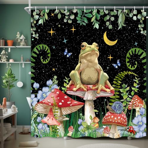JAWO Mushroom Shower Curtain, Boho Moon Stars Aesthetic Floral Shower Curtains, Funny Frog Cottagecore Decor Kids Children Bathroom Accessories Set with Hooks, 69 x 70 Inches Black