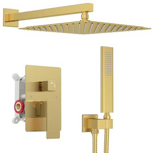 Iriber Champagne Bronze Rain Shower System with 12 Inch Shower Head and Handheld Bathroom Wall Mounted Brushed Golden Shower Set Contain Shower Faucet Mixer and Brush Gold Trim Kit (Valve Included)