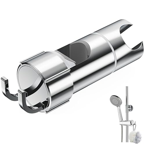 Shower Head Holder Replacement, Adjustable Clamp for 16–27mm Slide Rail, No Drilling, 360° Rotatable with 2 Hooks, Chrome Plated, Easy to Install, Universal for Handheld Showers