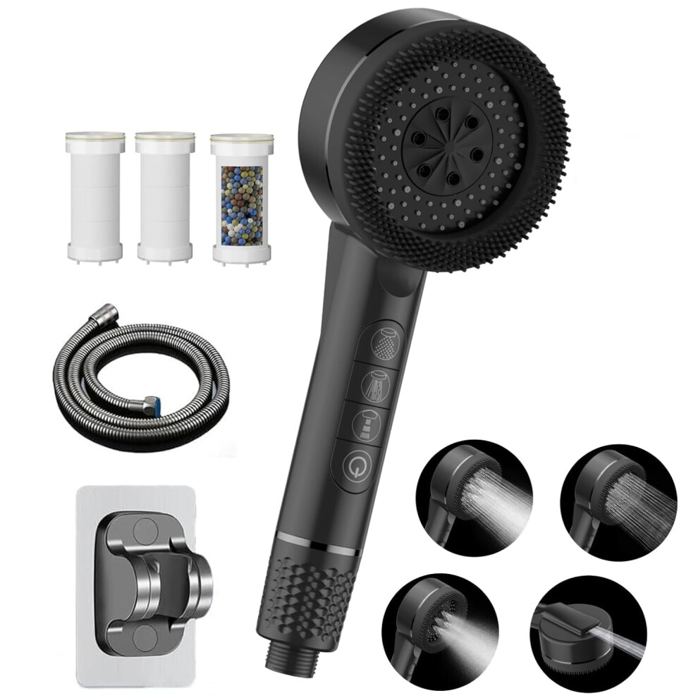 High Pressure Hard Water Filter Shower Head,With 1.5 m Shower Hose and Black Large Panel Base,Handheld Massage Shower Filter for Residual Chlorine Rem