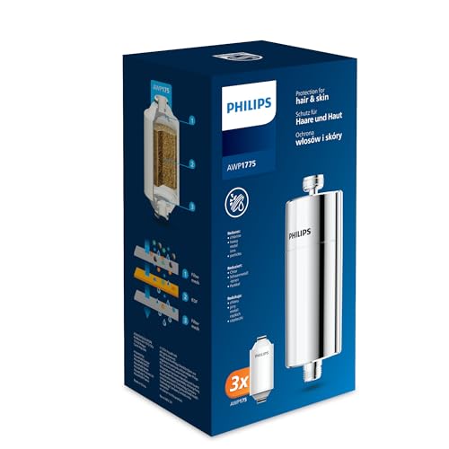 Philips Water in-Line Shower Filter and 3 Replacement cartridges, 50 000 L Filtration Capacity, Chrome, Reduces Chlorine by up to 99%, Easy to Install, fits All Standard Hoses and taps
