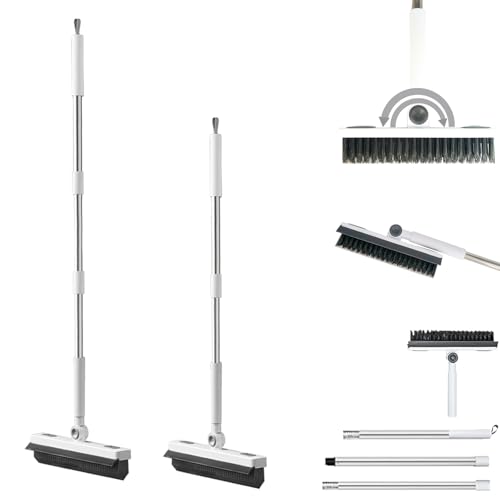 Floor Scrub Brush with Long Handle 54''- Stiff Bristle 2 in 1 Shower Scrubber with Squeegee Cleans Kitchen, Wall, Tile, Grout, Tub and Carpet, Brush Broom Scrubbing Garage, Patio Deck