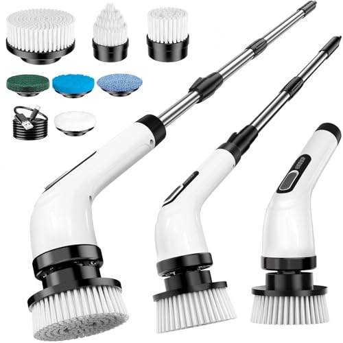 Electric Spin Scrubber,Cordless Electric Cleaning Brush,Shower Scrubber 2 Speeds,8 Brush Heads,IPX7 Waterproof,Adjustable Long Handle for Bathroom, Tub,Tile,and Car