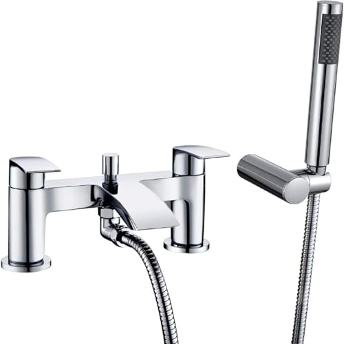 WasserRhythm Bath Mixer Taps with Shower Attachment Bathroom Tub Filler Tap Dual Lever Mixers Mono Monobloc Two Holes Chrome Brass 2 in 1 Bathtub Faucet with Handheld Shower Modern Deck Mounted