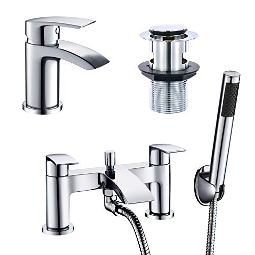 Hapilife Basin and Bath Mixer Taps with Shower Attachment Set Slotted Pop up Waste Waterfall Bathroom Sink Taps Cloakroom Bathtub Tub Filler Tap Mixers Monobloc Chrome Brass Bathroom Tap Set