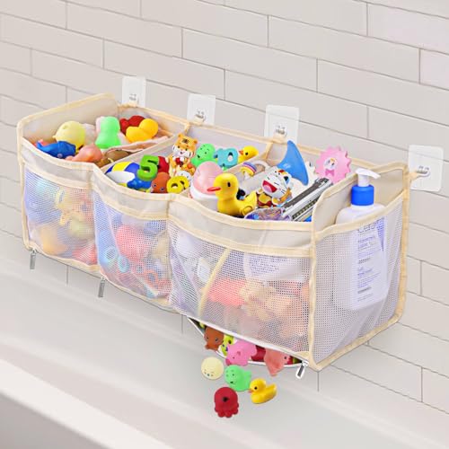 Dreamtop Bath Toy Organizer With 2 Side Pockets, 3 Compartment Storage With Large Openings, Shower Holder and Tidy With 8 Strong Self Adhesive Hooks