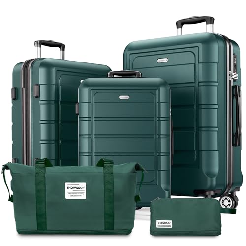 SHOWKOO Suitcase Sets 5 Piece Hardshell PC+ABS Expandable Lightweight Durable Travel Luggage with Travel Duffels Bag + Toiletry Bag -Green
