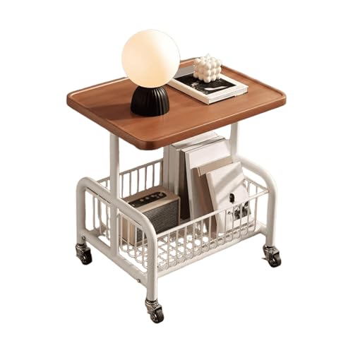 JinZao Small Side Table With Wheels Living Room, Bedroom Square Coffee Table, With A Solid Wood Tabletop And Iron Metal Storage Basket At The Bottom, 40x30x50cm(B)