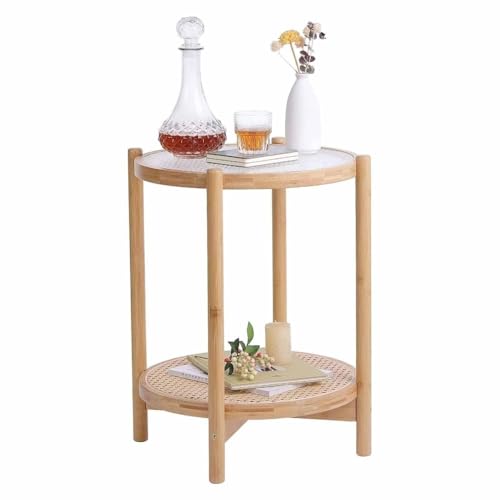 2 Tier Round End Table, Rattan Boho Side Table, Farmhouse Rattan Night Stand Bedside Tables, Small Mid Century Accent Tables for Small Spaces, Living Room, Bedroom Easy to Assemble(Khaki,17.7''x22'')