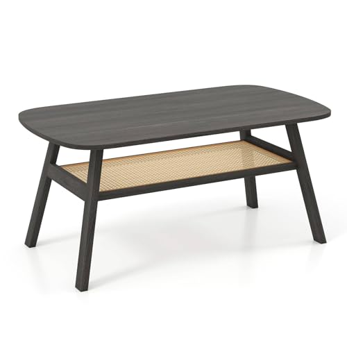 COSTWAY 2-Tier Coffee Table, Rectangular Cocktail Center Accent Tea End Sofa Side Table with Rattan Storage Shelf & Rubber Wood Legs for Living Room Bedroom Office, 100 x 55 x 45cm
