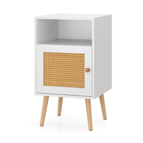 Multigot 1/2PCS Bedside Table, Wood Nightstand Sofa Side Table with Rattan Door, Open Storage Shelf and Solid Wood Legs, Accent Bedside Cabinet for Living Room Bedroom Office (1, White)