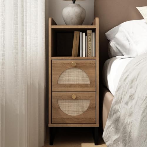 WINWY Narrow Nightstand for Small Spaces - 9.3" Slim Side Table with Rattan-Weave Drawers, Skinny Bedside Table with Open Shelf, Rustic Tall Thin Gap Filler for Bedroom & Sofa Side, Caramel Oak