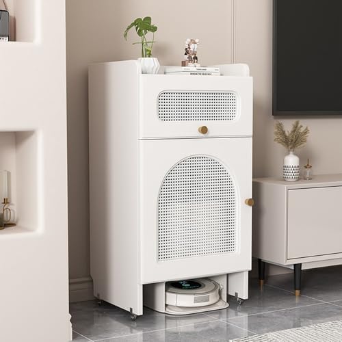 STARHMLUX Robot Vacuum Storage Cabinet, Side Table with Rattan Cabinet Doors and Casters, Space-Saving for Small Space, Bedroom, Kitchen, Office white 50x40x92cm