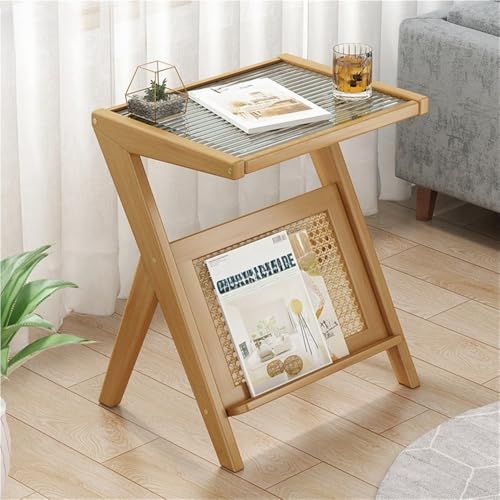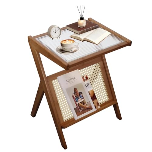 Z-shaped End Table Side Table Nightstand Rattan Magazine Rack Tempered Glass Top