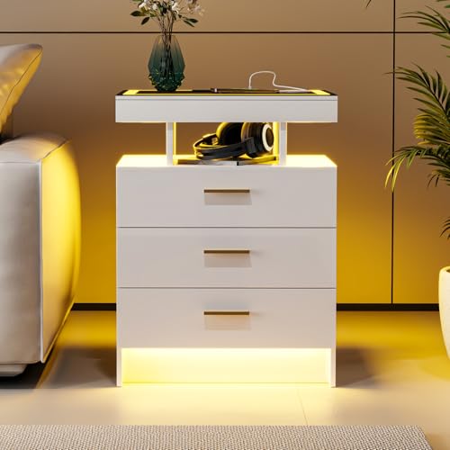 Gurexl LED Bedside Table with Wireless Charging Station,Smart Nightstand with Human Sensor, Highlights Bed Side Tables with 3 Drawers and Glass Tabletop for Bedroom Living Room Study,White