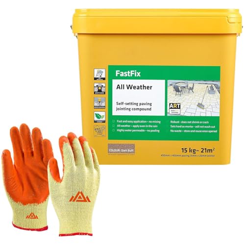 Fast Fix All Weather-Ready to Use, Self-Setting Paving Jointing Compound for Any Weather, Suitable for Stones Setts, Paving Block and Footpaths 15kg - 21 sq.m Dark Buff with Free Gloves