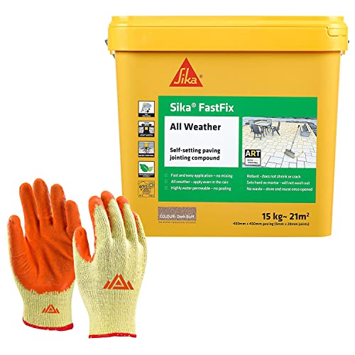 Sika Fast Fix All Weather-Ready to Use, Self-Setting Paving Jointing Compound for Any Weather, Suitable for Stones Setts, Paving Block and Footpaths 15kg - 21 sq.m Dark Buff with Free Gloves