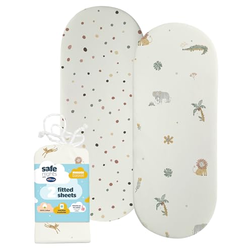 Silentnight Safe Nights Fitted Sheet - Moses Basket Mattress - Breathable 100% Cotton Jersey - Super Soft Kind to Baby Skin - Secure Fit with Elasticated Corners - 2 Pack, Moses Basket, Safari