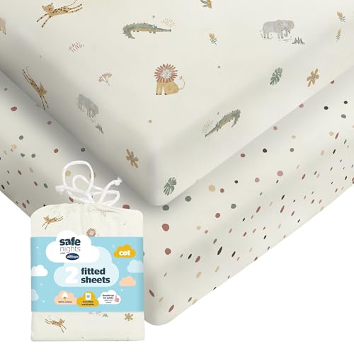 Silentnight Safe Nights Fitted Sheet - Cot Bed Mattress - Breathable 100% Cotton Jersey - Super Soft Kind to Baby Skin - Secure Fit with Elasticated Corners - 2 Pack, Cot Bed, Safari
