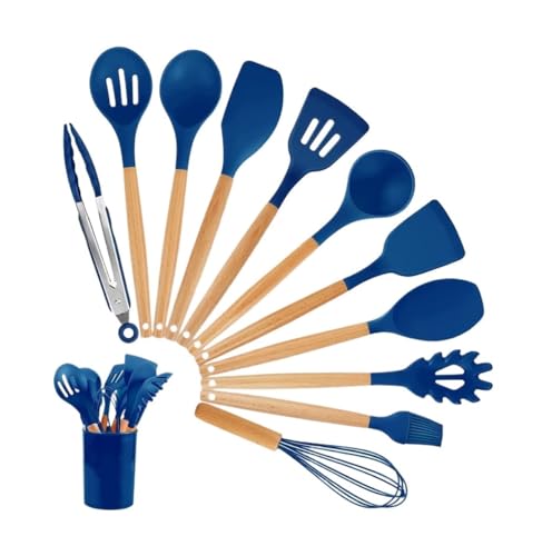 LOCKLGFMCZ 12 Pcs Silicone Cooking Utensils Set, Wooden Handle, Dark Blue Cookware sets