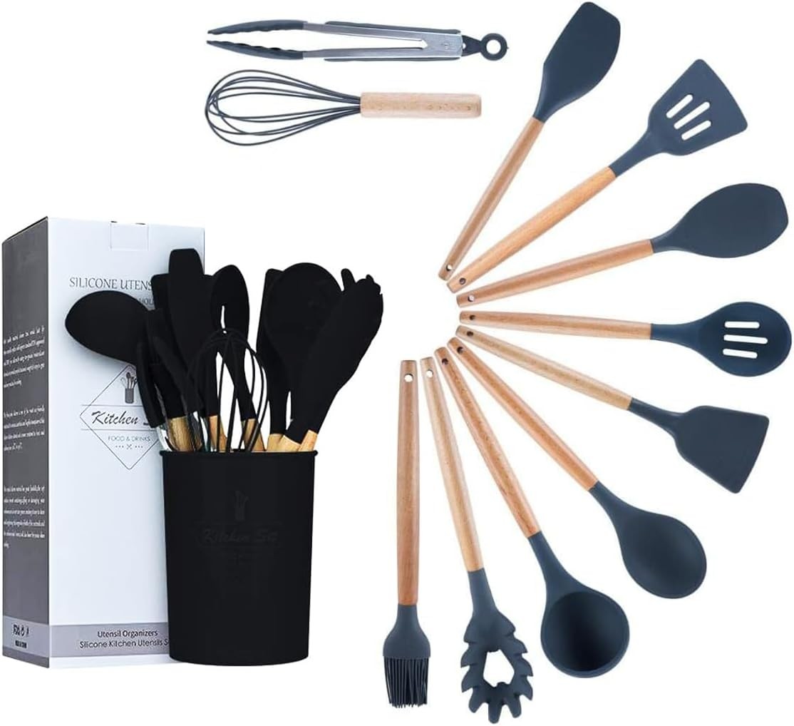 12 PCS Kitchen Utensil Set, Silicone Cooking Utensils with Holder, Natural Wood