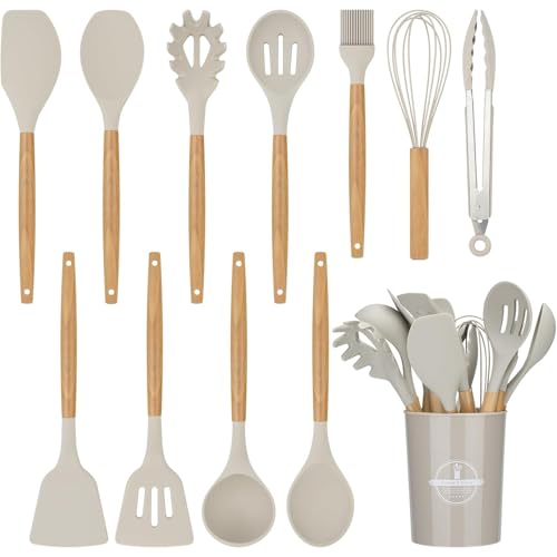 FIOUSY Kitchen Utensil Set, 12 PCS Silicone Cooking Utensils Set with Wooden Handle, Heat Resistant, Nonstick Cookware Tongs Spatula Spoon Set, Dishwasher Safe, Best Kitchen Tools (Grey)