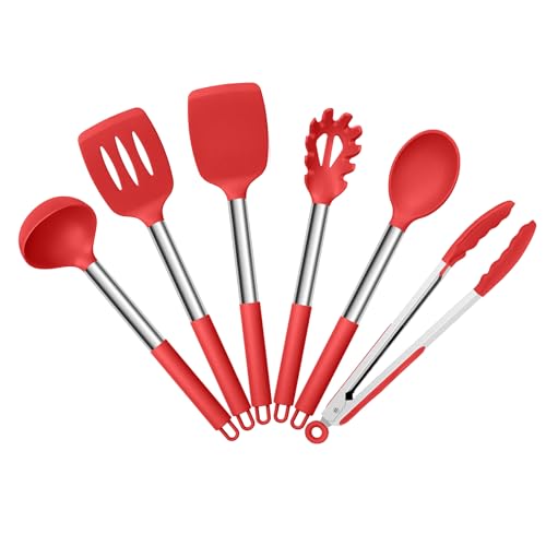 HaWare Kitchen Utensils Set, 6 Pcs Silicone Cooking Utensils Set with Stainless Steel Handle, Non-Stick Cooking Tools Turner Spatula Spoon Tong, Heat Resistant & Non-Scratch, Dishwasher Safe-Red