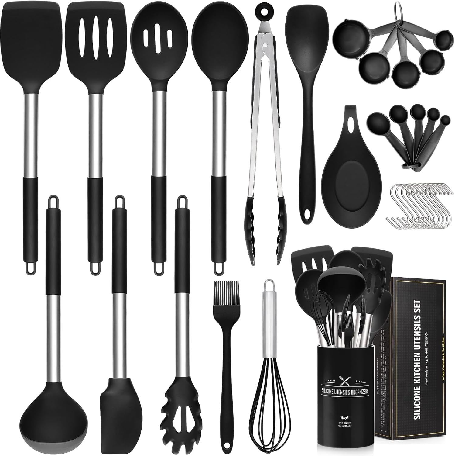 38 Pieces Kitchen Utensils Set, BEWOS Silicone Cooking Utensils Set with Spatula, Utensil Holder and Measuring Spoons, Nonstick Heat Resistant, Black Kitchen Gadgets, Stainless Steel Handle