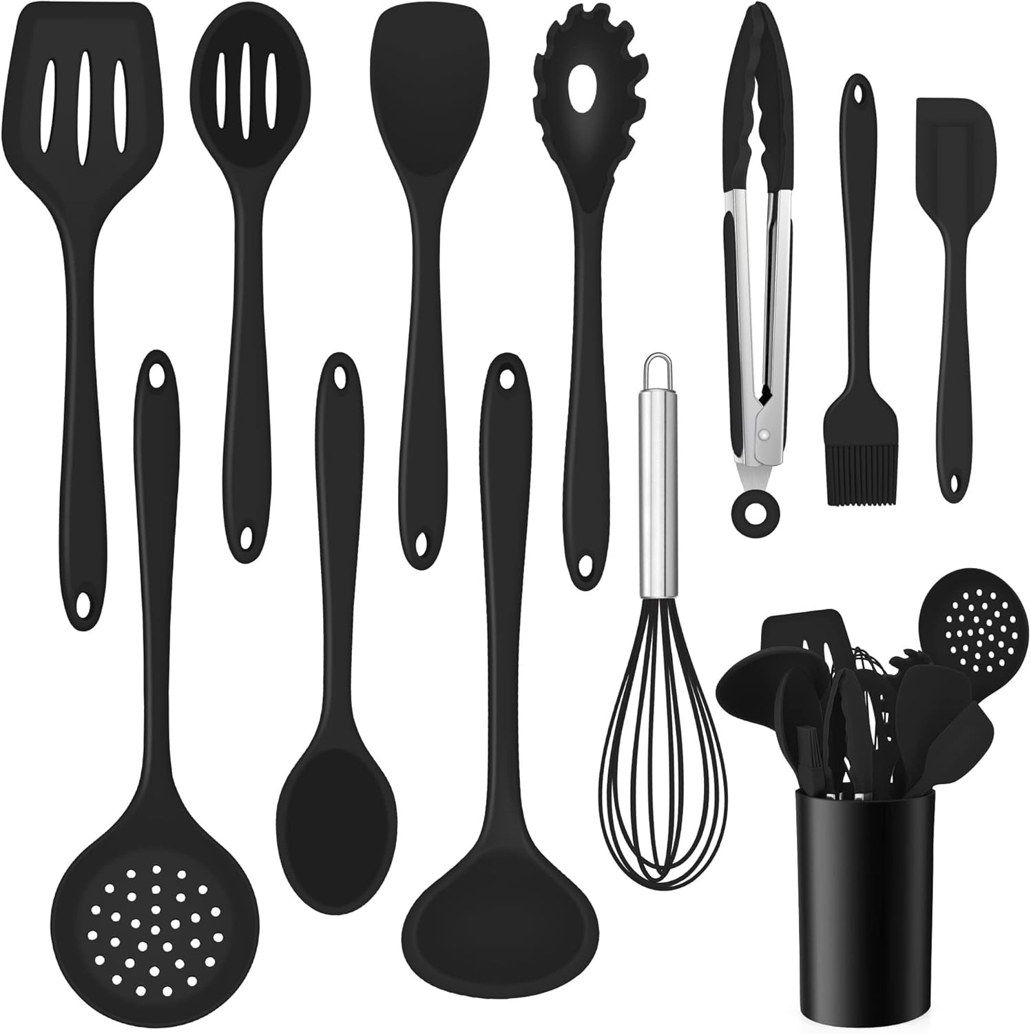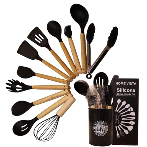 Home Vista 12 Pcs Silicone Cooking Utensils Set with Holder – Heat Resistant, BPA-Free Tools for Non-Stick Cookware – Ideal for Homes, Daily Cooking & Gifting – Black Kitchen Set