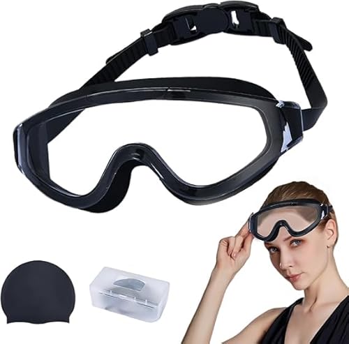 Swimming Goggles, Swimming Goggles with Silicone Earbuds, Anti-Fog Swimming Goggles for Audlt, No Leak Wide View Clear Vision Goggles (Black)