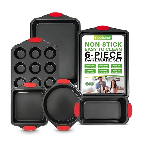 Nutrichef 6-Piece Steel Nonstick Bakeware Set - Carbon Steel Baking Tray Set w/Heatsafe Red Silicone Handles, Oven Safe Up to 450°F, Loaf Muffin Round, Cookie Sheet, Baking Pan NCSBS6S , Black