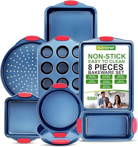 NutriChef Baking Tray Set, Oven Bakeware Trays, 8 Piece Non-Stick Oven Safe - Baking Sets, Includes: Cookie Sheets Pan, Loaf Pan, Pizza Pan, Muffin Tins, Cake Tin, Blue w/ Red Silicone Handles