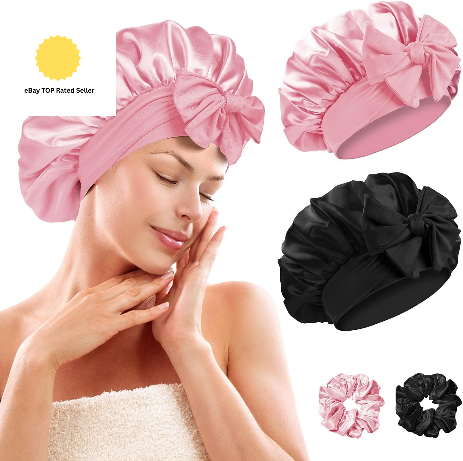 2PCS Satin Bonnet, Silk Bonnet Hair Wrap for Sleeping, Hair Bonnet for Bath, Tie Band for Women Long Curly Braid Hair (Black, Pink)