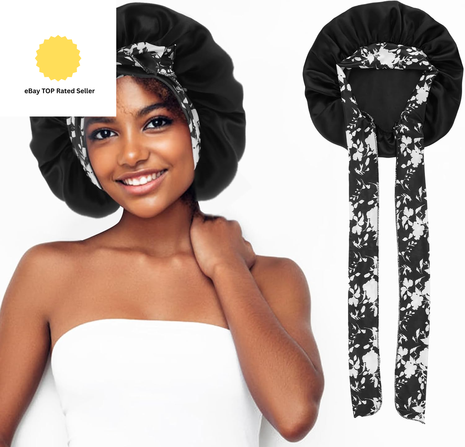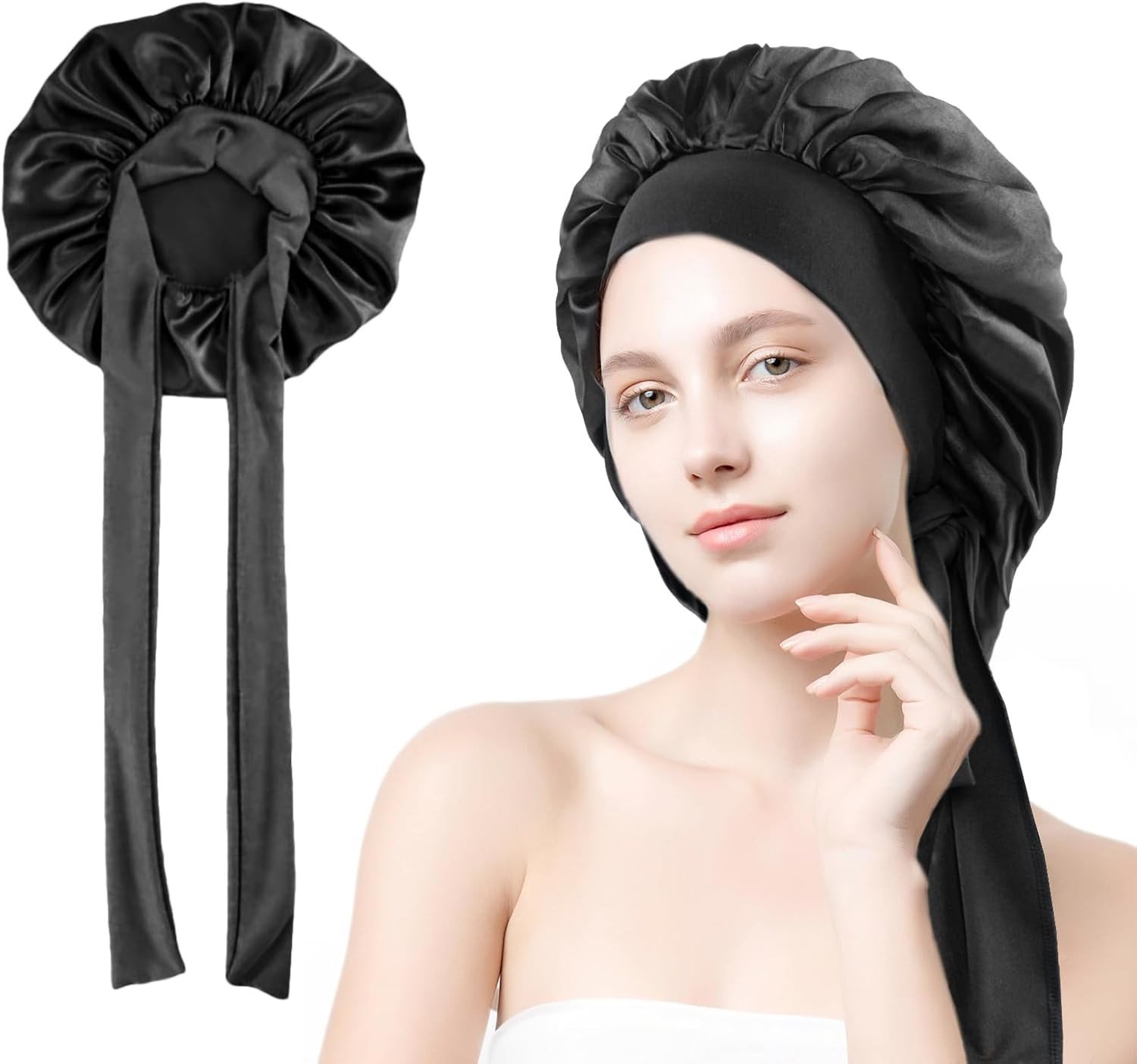 Curly Hair Silk Bonnet for Sleeping, Adjustable Satin Shower Cap with Tie Band f