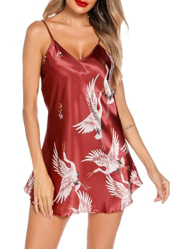 Litherday Women's Satin Negligee Nightdress Babydoll Lingerie Silk Nighty Chemise Nightgown Sleepwear V Neck Nightwear Short Dress(Dark Red,M