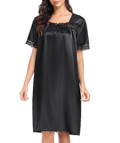 Lovasy Satin Nightdress for Women UK Silk Nighties for Women Ladies Short Sleeve Lace Trim Satin Night Dress Nighty Nightwear,Black,L