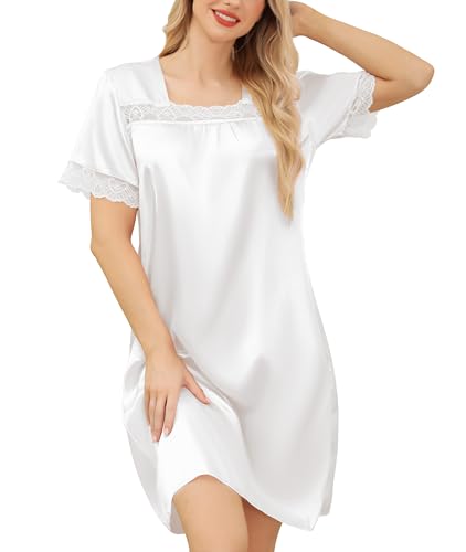 Lovasy Satin Nightdress for Women UK Silk Nighties for Women Ladies Short Sleeve Lace Trim Satin Night Dress Nighty Nightwear,White,M