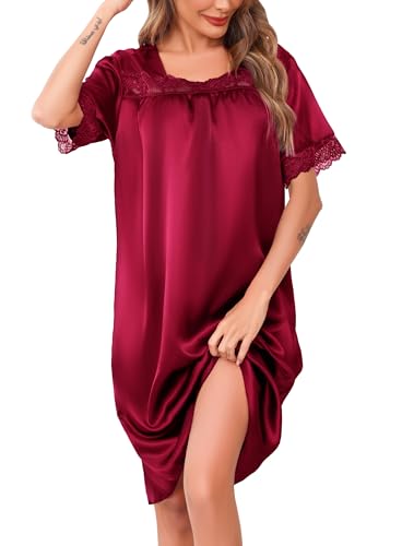 Lovasy Satin Nightdress for Women UK Silk Nighties for Women Ladies Short Sleeve Lace Trim Satin Night Dress Nighty Nightwear,Purplish Red,M