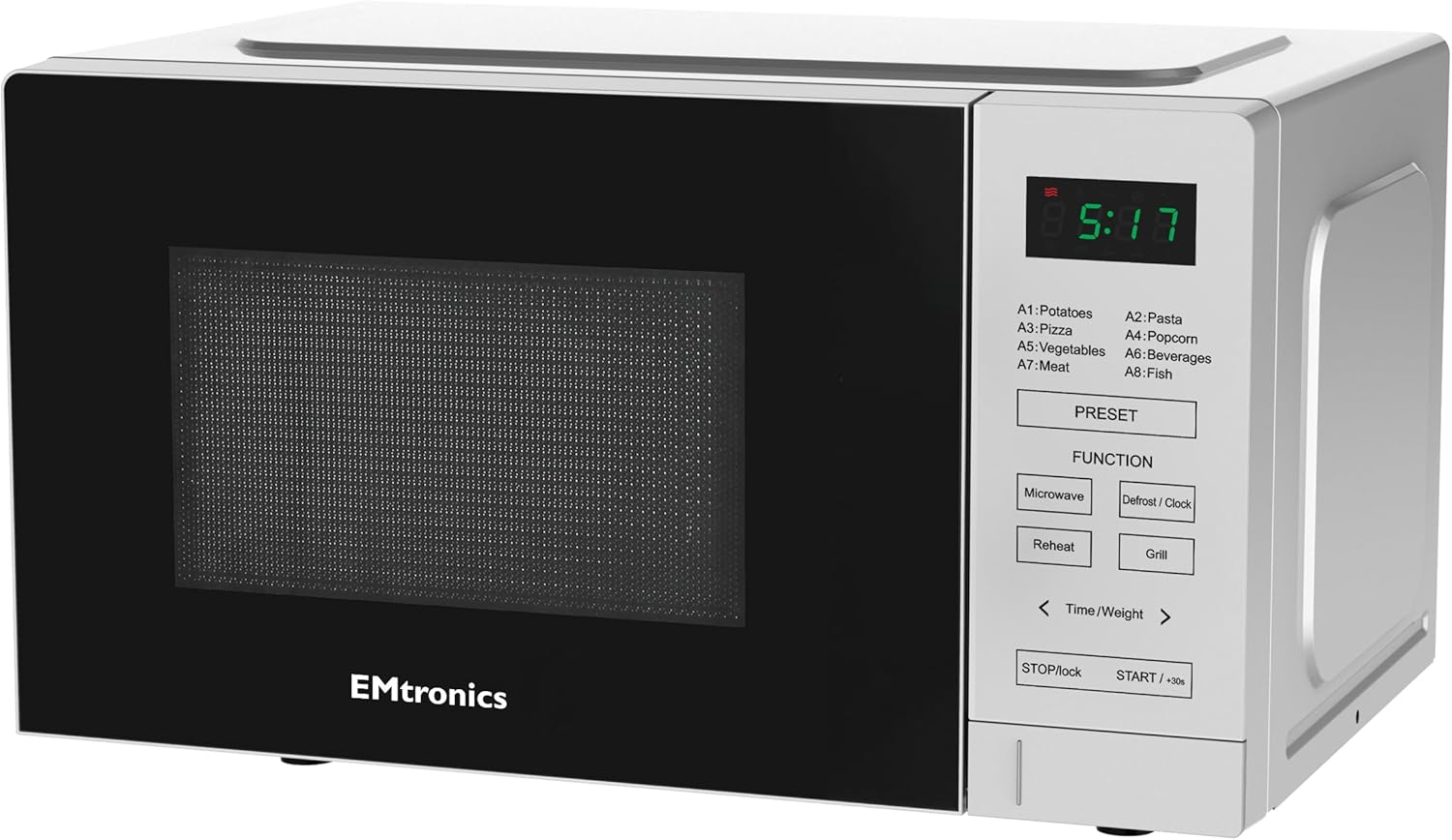 EMtronics 20 Litre 700W Digital Microwave with 800w Grill, 10 Power Levels, 8 Preset Options, Defrost Function and Cavity Light - Silver