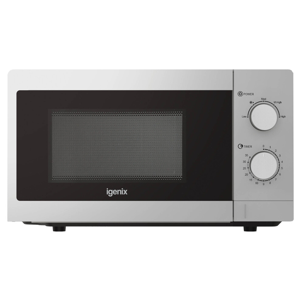 Igenix 20L 800W Silver Manual Microwave – 5 Power Levels, Defrost Setting, 35-Min Timer, Push Button Door, 255mm Turntable – IGMS08080S