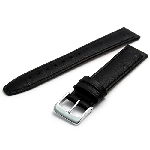 Men's Genuine Leather Watch Strap Band Ostrich Grain 16mm Black with Chrome (Silver Colour) Buckle WH1010G