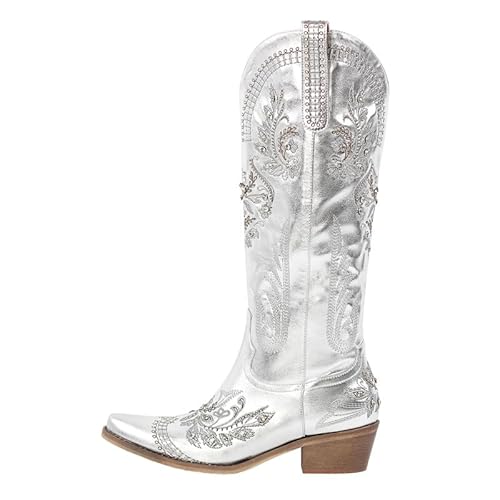 blingqueen Metalllic Boots Cowboy Boots for Women Embroidered Cowgirl Boots Zip Up Knee High Boots Wide Calf Boots Block Chunky Heel Studded Diamond Heel Crystal Rhinestone Western Boots Silver Size 5