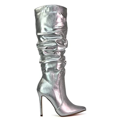 Womens Stiletto Knee High Boots Ladies Slouched High Heel Pointed Toe Daytime Evening Long Shoes Silver Metallic