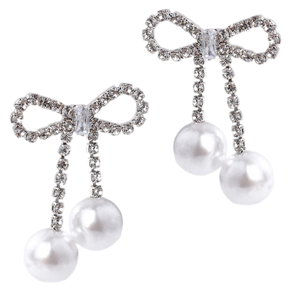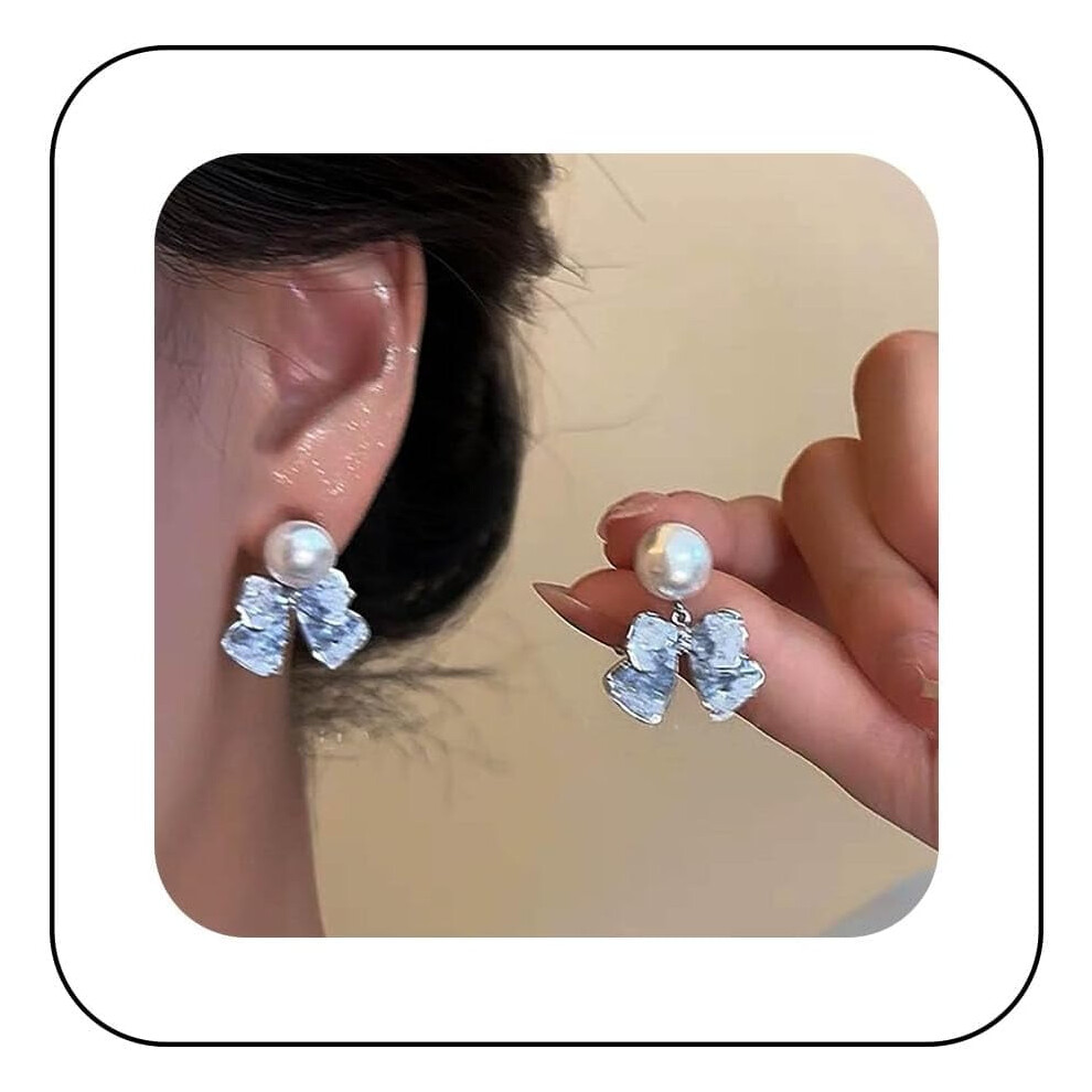Bohemian Crystal Bow Drop Earrings Silver Pearl Bow Tie Earrings Blue Cz Bow Dangle Earrings Small Round Pearl Stud Earrings Jewelry for Women