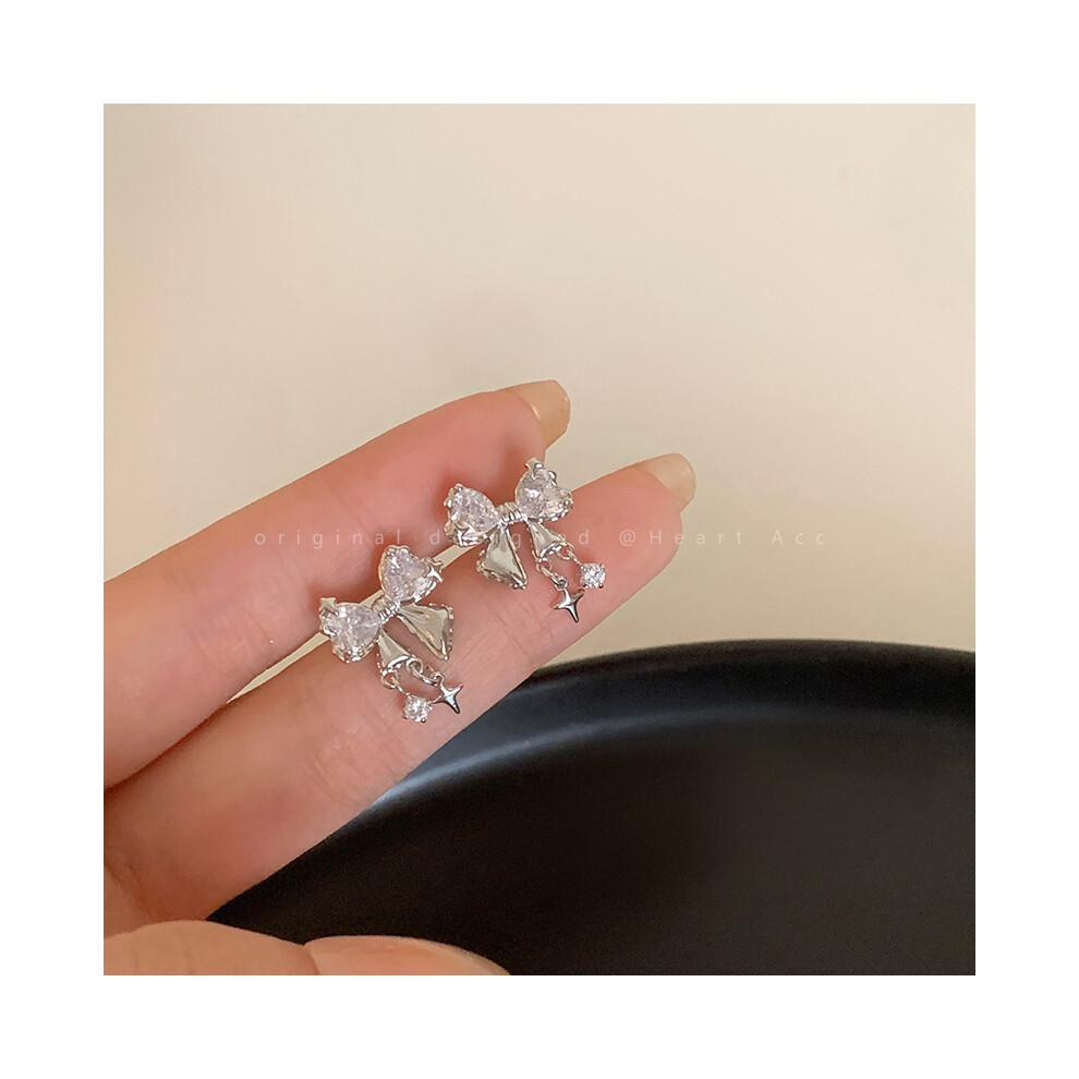 925 Silver Fairy Bow Earrings Female Temperament Net Red Diamond Earrings Pierced Girl Heart Earrings