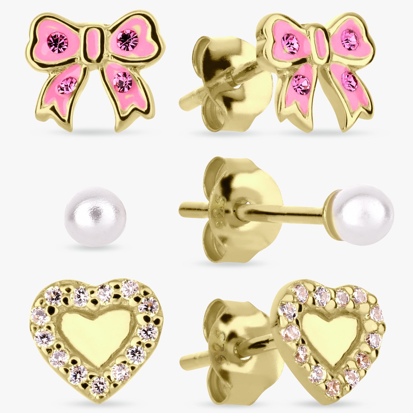Revere Kids Gold Plated Silver Bow Heart Stud Earrings Set