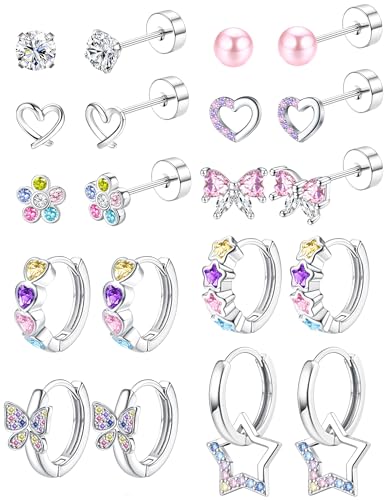 FIOROYAL 10Pairs Flat Back Earrings Stud Hoop Earrings for Women Girls Hypoallergenic Surgical Steel Earring Silver Cute Pearl Bow Colorful CZ Heart Butterfly Flower Stud Hoop Kids Earrings for Girls