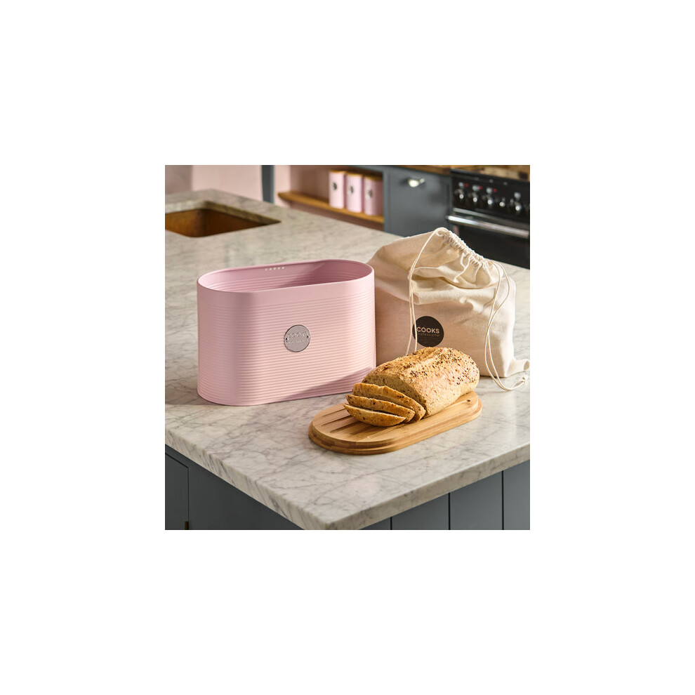 (Pink & Silver) Cooks Professional Ribbed Bread Bin with Linen Bag & 2-in-1 Bamboo Cutting Board Lid
