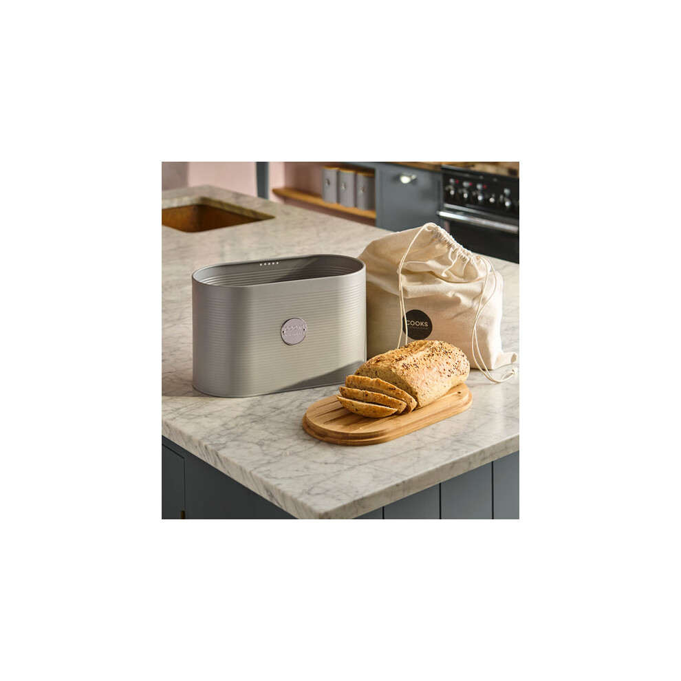 (Grey & Silver) Cooks Professional Ribbed Bread Bin with Linen Bag & 2-in-1 Bamboo Cutting Board Lid