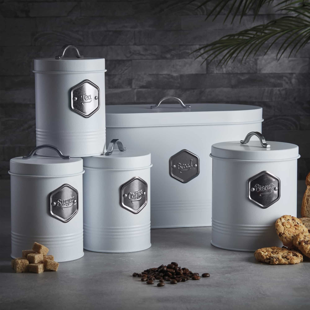 Cooks Professional 5-Piece Kitchen Storage Set: Bread Bin, Biscuit Tin & Tea, Coffee & Sugar Canisters - White/Silver (K301)